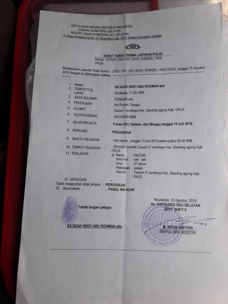 Proses Hukum terus berlanjut di POLRES OKU Selatan semoga Kebenaran menyertai ibuk Saadah yang memang benar pemilik Rumah dari hasil pernikahan nya dengan Suaminya Almarhum TABRANI sekarang Ibuk Saadah selaku Janda yang di tinggal mati Suami nya harapan nya agar yang menghuni rumah dan yang merusak konci rumah nya dapat di Proses sesuai Hukum yang berlaku.