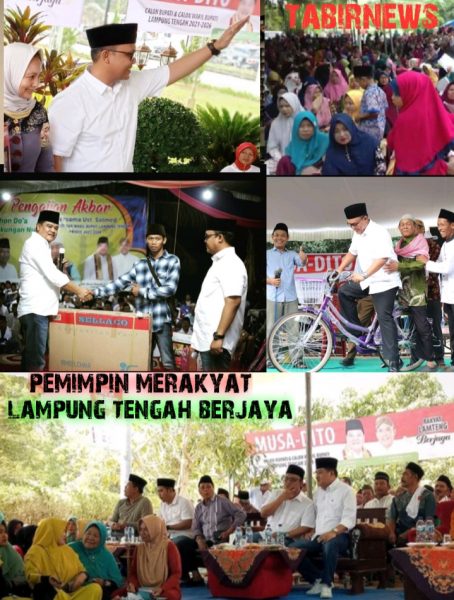 BREAKING NEWS–LAMPUNG TENGAH-Tabirnews.com— Acara Pengajian dan Silaturahmi Paslon Bupati dan Wakil Bupati Lampung Tengah MUSA-DITO, Bersama Ustad Solmed Selaku Sang Penceramah, Khususnya Memberikan Kedamaian Penyejuk Hati Warga Masyarakat Lamteng, Acara Tablig Akbar Pengajian Silahturahmi Tersebut, Digelar Diseluruh Wilayah Kampung Kampung Tepatnya di Kabupaten Lampung Tengah, Bertemakan Menyapa,dan Mengajak,Menuntun Hati Jiwa Masyarakat Lamteng Melalui Bentuk Tablig Akbar Pengajian.