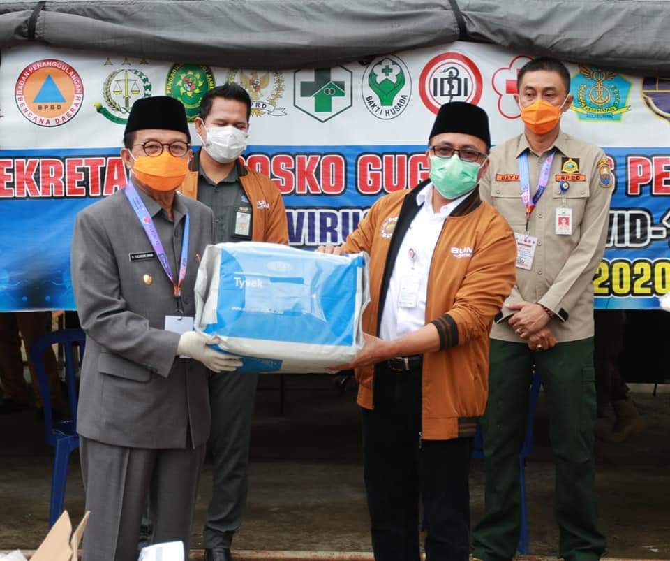 Jambi, tabirnews.com – Gubernur Jambi selaku Ketua Gugus Tugas Penanganan Covid-19 Provinsi Jambi, Dr.Drs.H.Fachrori Umar,M.Hum menerima bantuan perlengkapan medis untuk penanganan Covid-19 dari BUMN yang tergabung dalam Forum Sinergitas BUMN Provinsi Jambi, di Posko Gugus Tugas Penanganan Covid-19 Provinsi Jambi, halaman kantor BPBD Provinsi Jambi, Selasa (07/04/2020). Secara simbolis, bantuan diserahkan oleh Kepala Bulog Divre Jambi Bachtiar,AS dan GM PT Telkom Jambi,M.Zaidan Jauhari.