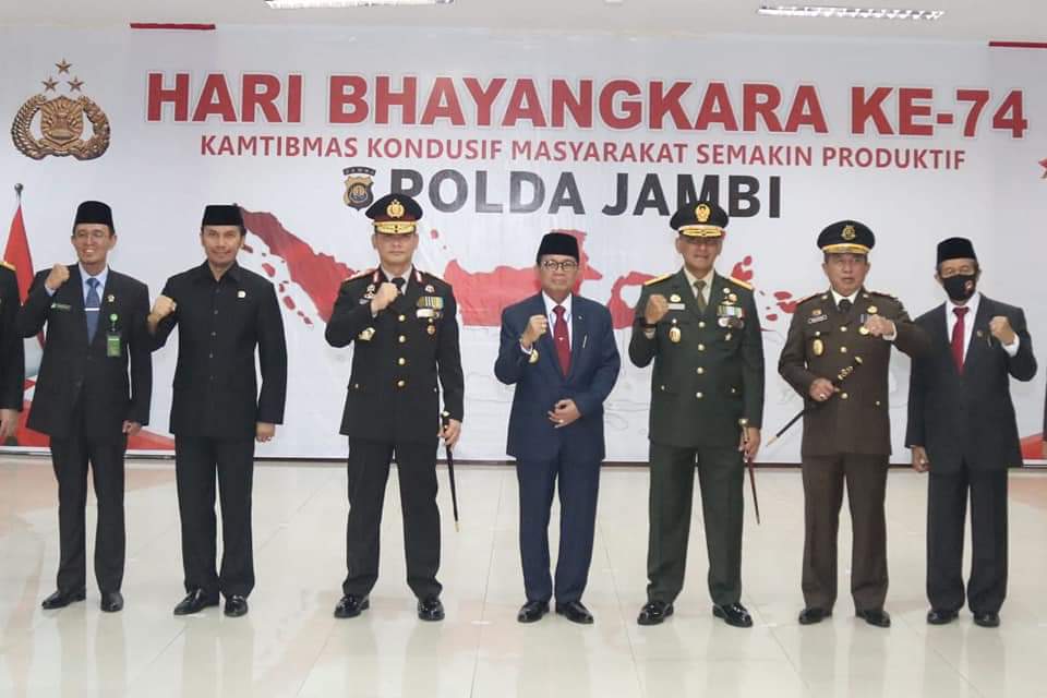 Jambi, Tabirnews.com – Gubernur Jambi Dr.Drs.H.Fachrori Umar,M.Hum berharap agar sinergitas Pemerintah Daerah (Pemda) dengan Kepolisian Daerah (Polda) dan Forum Komunikasi Pimpinan Daerah (Forkopimda) semakin solid, berpadu dalam pembangunan untuk mewujudkan kemajuan daerah dan kesejahteraan masyarakat. Harapan tersebut disampaikan Fachrori usai mengikuti Upacara Hari Ulang Tahun (HUT) Ke-74 Bhayangkara yang diselenggarakan secara virtual, dengan Presiden Republik Indonesia Ir.H.Joko Widodo (Jokowi) sebagai inspektur upacara di istana Negara, Rabu (01/07/2020). Untuk wilayah Polda Jambi diselenggarakan di Aula Mapolda Jambi.