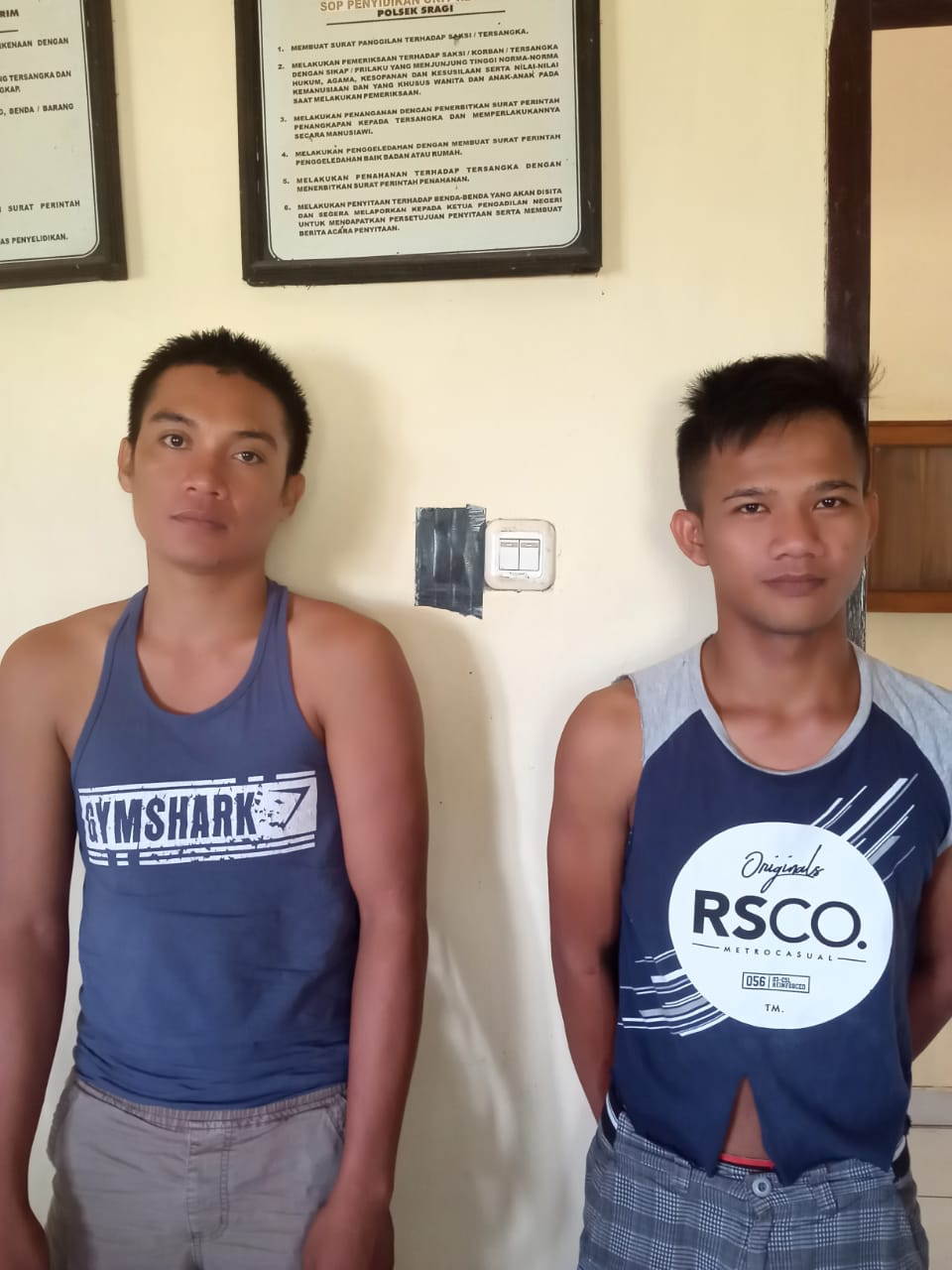 BREAKING NEWS–LAMPUNG SELATAN–Tabirnews.com–Dua warga asal Desa Sumber Agung, Kecamatan Sragi, Abdir rohman (28) dan warga Desa Tataan, Kecamatan Penengahan, Lampung selatan, Maidi Rozi (34) terpaksa harus mendekam di tahanan Mapolsek Sragi.
