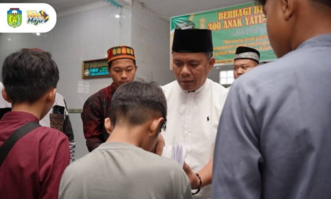 Tebo, Tabirnews.com – Pemerintah Kabupaten Tebo berkolaborasi bersama Komunitas Tebo Berbagi dan EO Impian Project menggelar kegiatan berbagi bersama 300 anak yatim dan piatu yang berasal dari 14 kelurahan dan desa di Kabupaten Tebo. Kegiatan tersebut dilaksanakan di Surau Al-Ikhlas Sumbersari, Kelurahan Tebing Tinggi pada Jumat (06/03/2026).