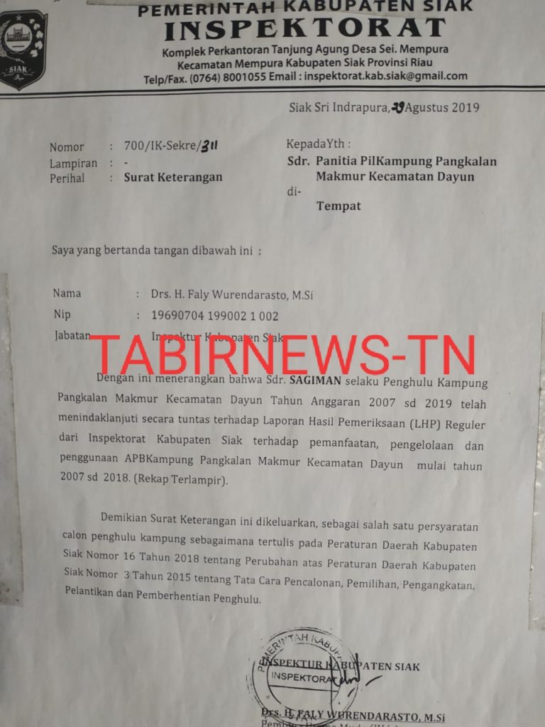 “DIDUGA INSPEKTORAT KABUPATEN SIAK Drs. H.FALY WURENDARASTO. MSi. ASAL SAJA DALAM MENGELUARKAN SURAT KETERANGAN”...